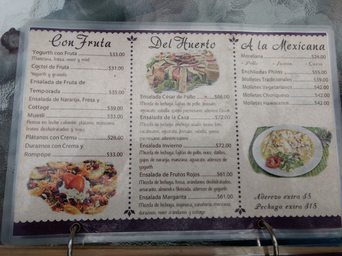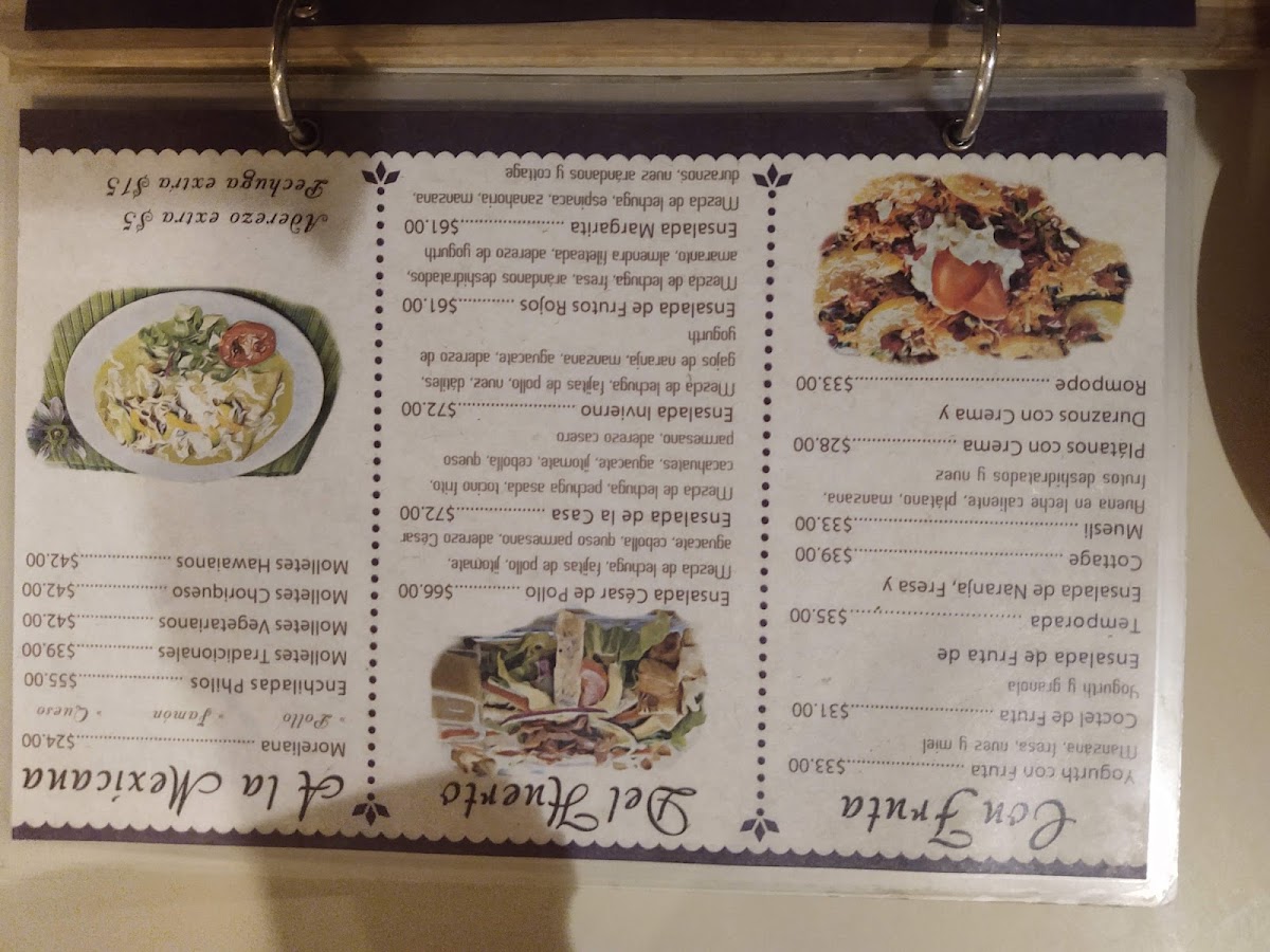 The food offerings include hotcakes, enchiladas with different ingredients such as chicken, chilaquiles served with egg or chicken, as well as savory options like chicken wraps and arrachera baguettes. Salads and sandwiches are also available, providing lighter meal choices.