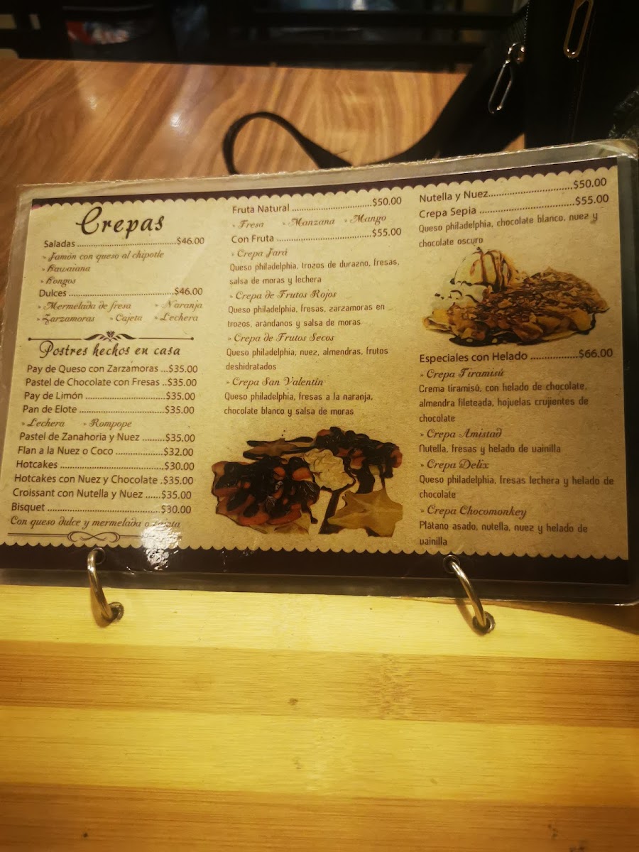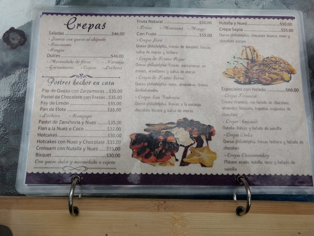 The dessert section includes items such as carrot cake, tiramisú crepes, and chocolate cake with strawberries, catering to those seeking sweet finishes.